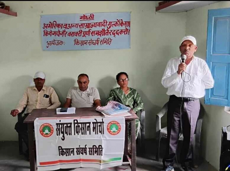 रामनगर। किसान संघर्ष समिति द्वारा कानिया रामनगर में अमेरिका द्वारा भारत पर लगाए गए पचास प्रतिशत आयात शुल्क (टैरिफ) के भारत पर पड़ रहे प्रभाव को लेकर अमेरिका और अन्य साम्राज्यवादी देशों से किये गये सभी गैर बराबरी पूर्ण समझौते रद्द करने के मामले को लेकर संगोष्ठी का आयोजन किया।संगोष्ठी को संबोधित करते हुए समाजवादी लोक मंच के संयोजक मुनीष कुमार ने कहा कि विगत अप्रैल में अमेरिका ने भारत पर डेयरी व कृषि उत्पादों से आयात शुल्क हटाने का दबाव बनाते हुए 7 अगस्त से 25 प्रतिशत टैरिफ लगाने की धमकी दी थी। जिसके बाद नीति आयोग ने नवीन अमेरिकी व्यापार व्यवस्था के तहत भारत-अमेरिका कृषि व्यापार को बढ़ावा देना शीर्षक से वर्किंग पेपर नं 5 जारी किया था।