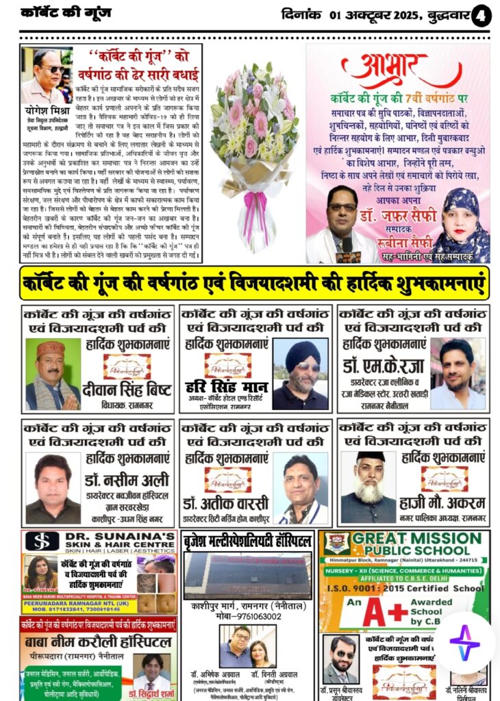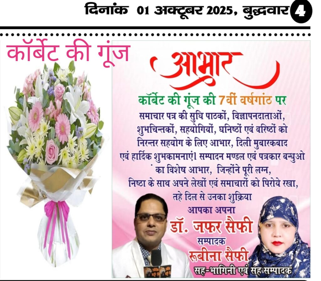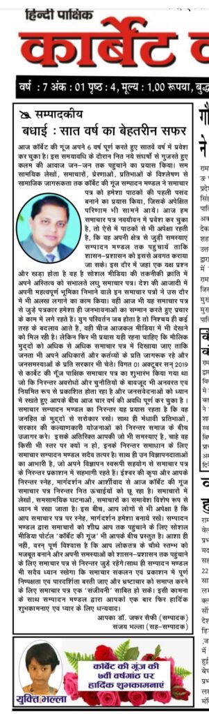 आम जन की आवाज व सच्चाई के आईने लोकप्रिय समाचार पत्र एवं न्यूज़ पोर्टल *कॉर्बेट की गूँज* के द्वारा 6 वर्ष की आयु पूर्ण करके 7 वे वर्ष में प्रवेश करने के उपलक्ष्य में आप सभी सुधी पाठको व शुभचिंतकों, विज्ञापन दाताओं का दिल से आभार🎂 Happy Birthday to C.K.G.🎂